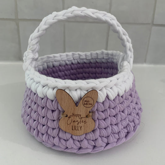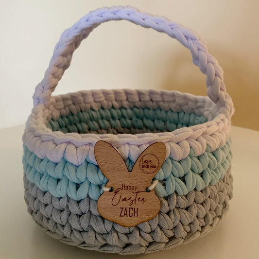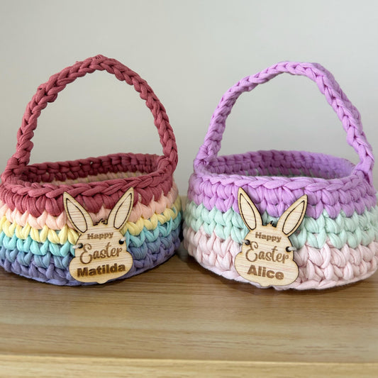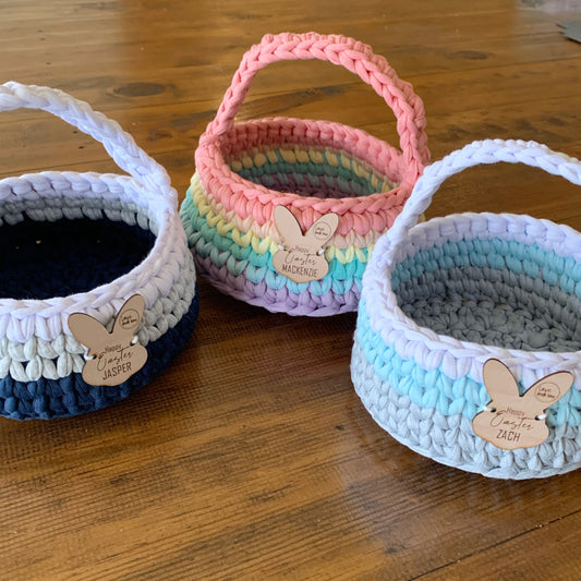 Our custom Handmade baskets are made with recycled cotton T-shirt yarn available in a big range of colours and your choice of personalised names/messages.